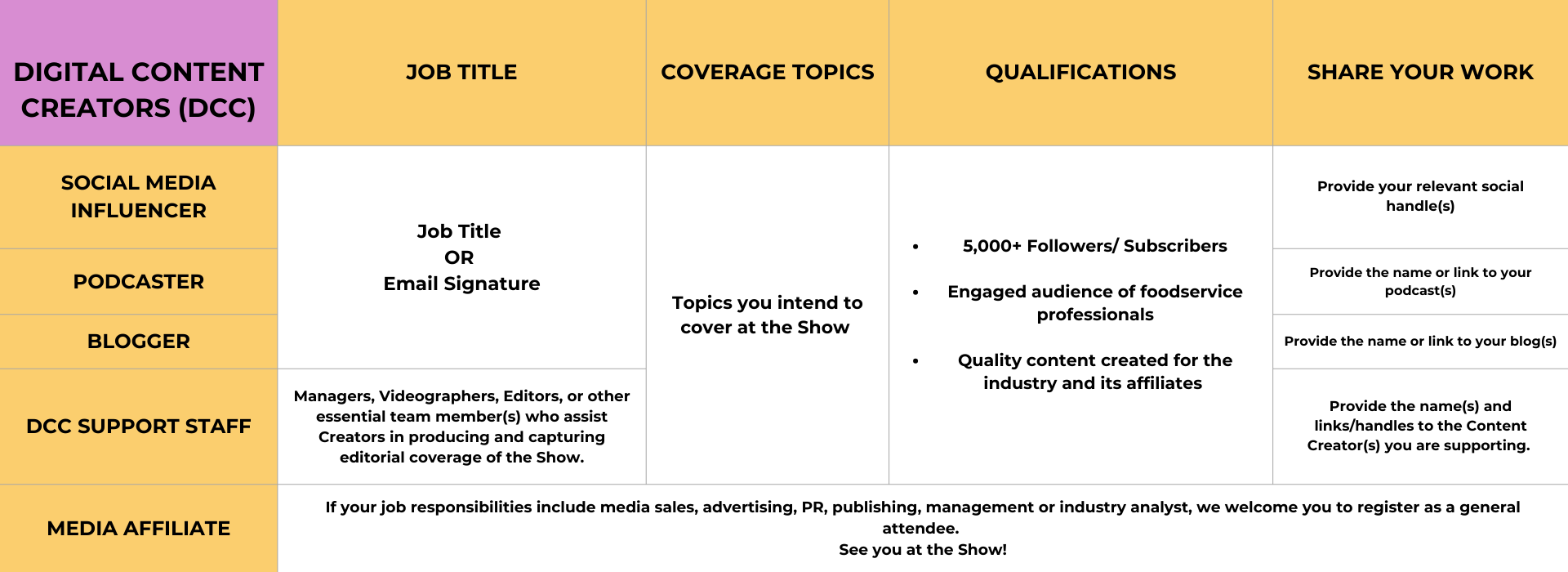 Those with 5,000 or more followers, an engaged foodservice audience, and content created for the industry are invited to submit their registration to attend as official content creators in accordance with the qualifications below.